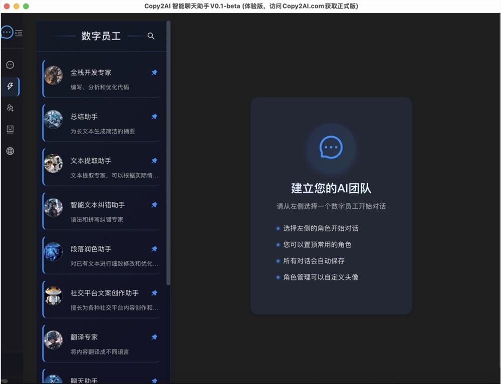 用户可以根据自己的需求,从预设的多种数字员工角色中选择,如写作、翻译专家、数据分析员等。每个角色都具有独特的技能和功能,能够帮助用户完成特定的任务。同时用户可以基于提示工程构建专属AI数字团队,可以自由切换角色进行对话。这种多样化的角色选择,让用户能够根据自己的需求,打造最适合自己的AI助手团队。