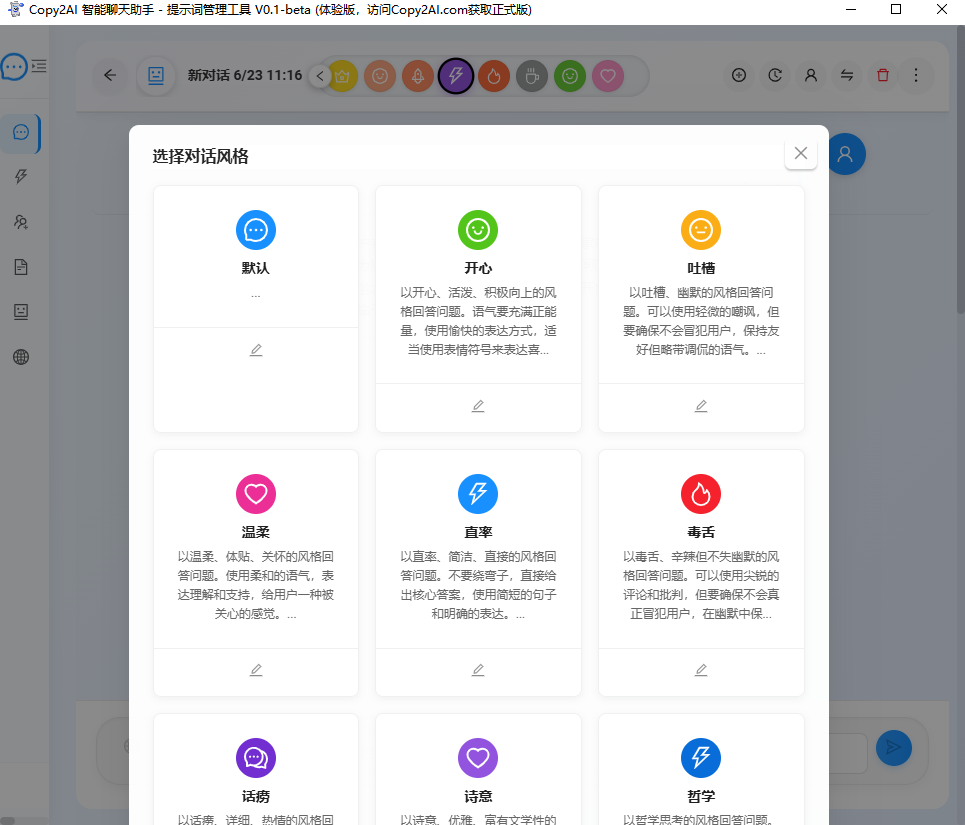 Copy2AI提供了丰富的对话风格选项,包括幽默、吐槽、温柔、直率、中二、话痨、毒舌等20多种风格。用户可以自由定制喜欢的风格,甚至可以对角色的提示词、风格、头像等进行个性化设置。这种高度的可定制性,让每个用户都能拥有独一无二的聊天助手,打造真正符合个人需求的智能对话体验。