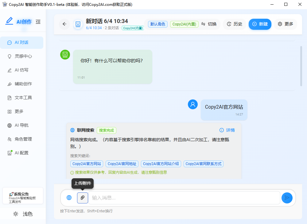 Copy2AI支持自然语言对话,能够理解并回应用户的各类问题和需求。无论是日常闲聊、寻求建议还是获取信息,它都能以自然流畅的方式进行交流。联网搜索增强功能使其能够实时获取最新信息,为用户提供专属的对话体验。这种智能化的对话体验,让用户能够以最自然的方式与AI进行交流,感受科技带来的便捷。