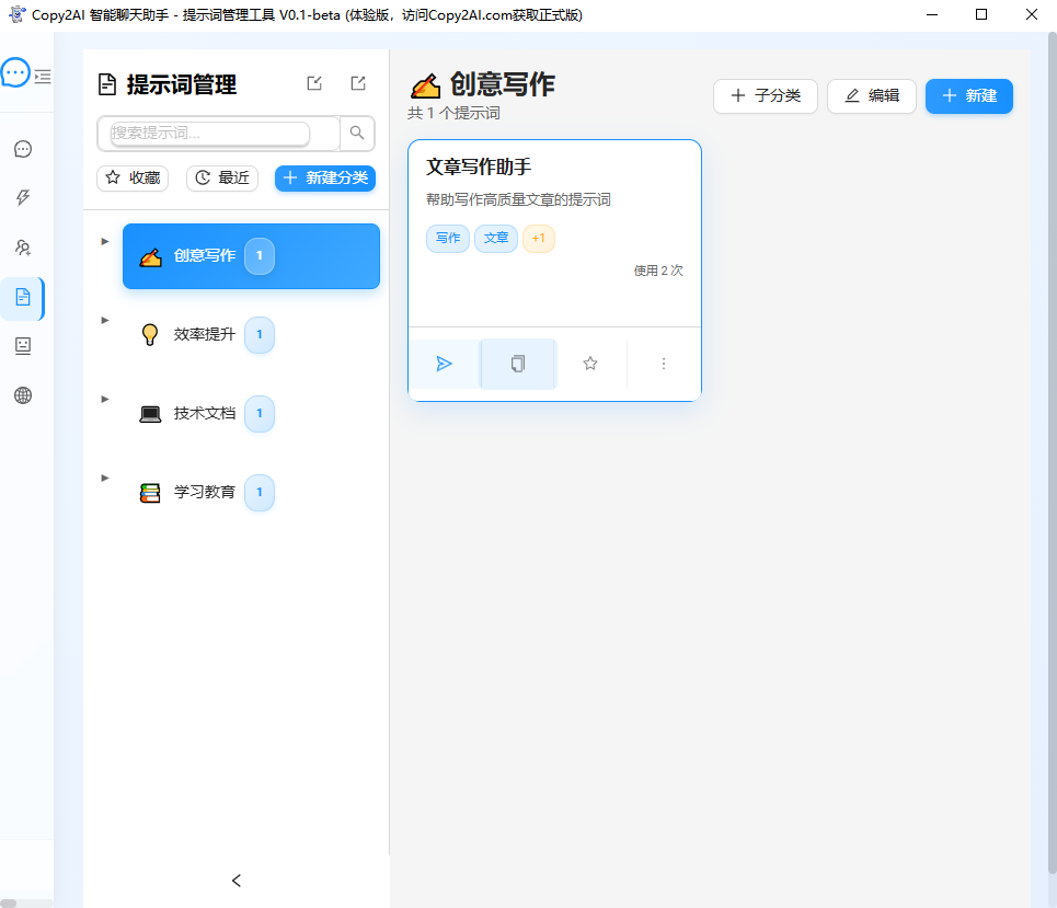 用户可以根据自己的需求,收集高质量的AI提示词放到Copy2AI智能聊天助手进行保存,可以自由设置分类和标签,实现高效的提示词管理,同时支持使用提示词一键应用到AI进行智能对话,程序会自动统计使用次数,助力发掘高频率使用提示词。这种提示词管理功能,让用户能够更好地组织和利用AI功能,提高使用效率。